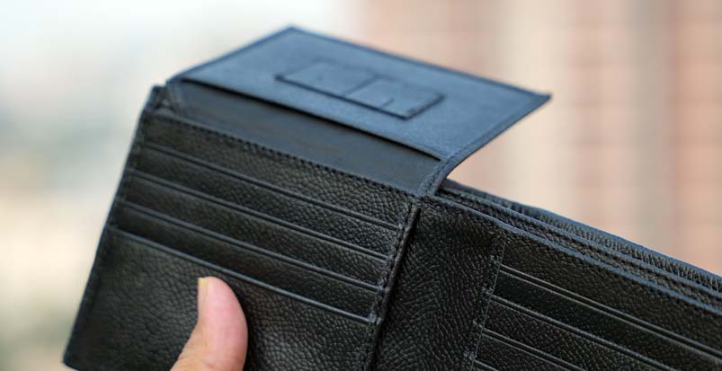 - Design: Classic bifold with folded card section.